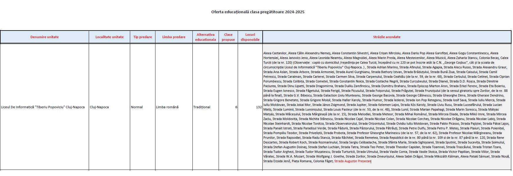 Înscrierea în clasa pregătitoare la Liceul de Informatică „Tiberiu Popoviciu”, pentru anul școlar 2024-2025, se va desfășura la sediul unității noastre de pe Calea Turzii nr. 140-142, în perioada 11 aprilie – 14 mai 2024, cu excepția zilelor libere și a sărbătorilor legale, după cum urmează: