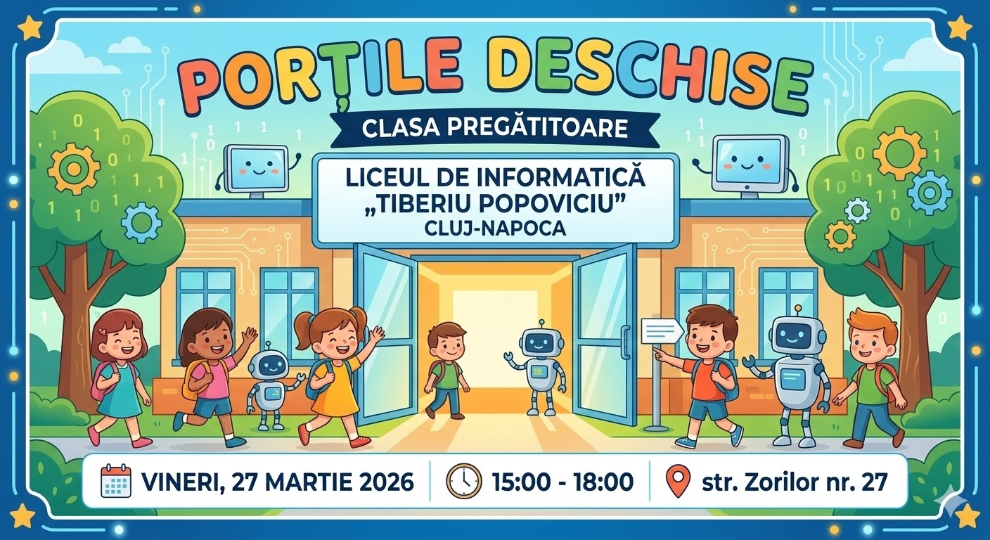 Ziua Porților Deschise pentru Clasa Pregătitoare 2026-2027 la Liceul de Informatică „Tiberiu Popoviciu”, Cluj-Napoca, se va desfășura vineri, 27.03.2026, între orele 15.00-18.00 în locația de pe strada ZORILOR, nr. 27.