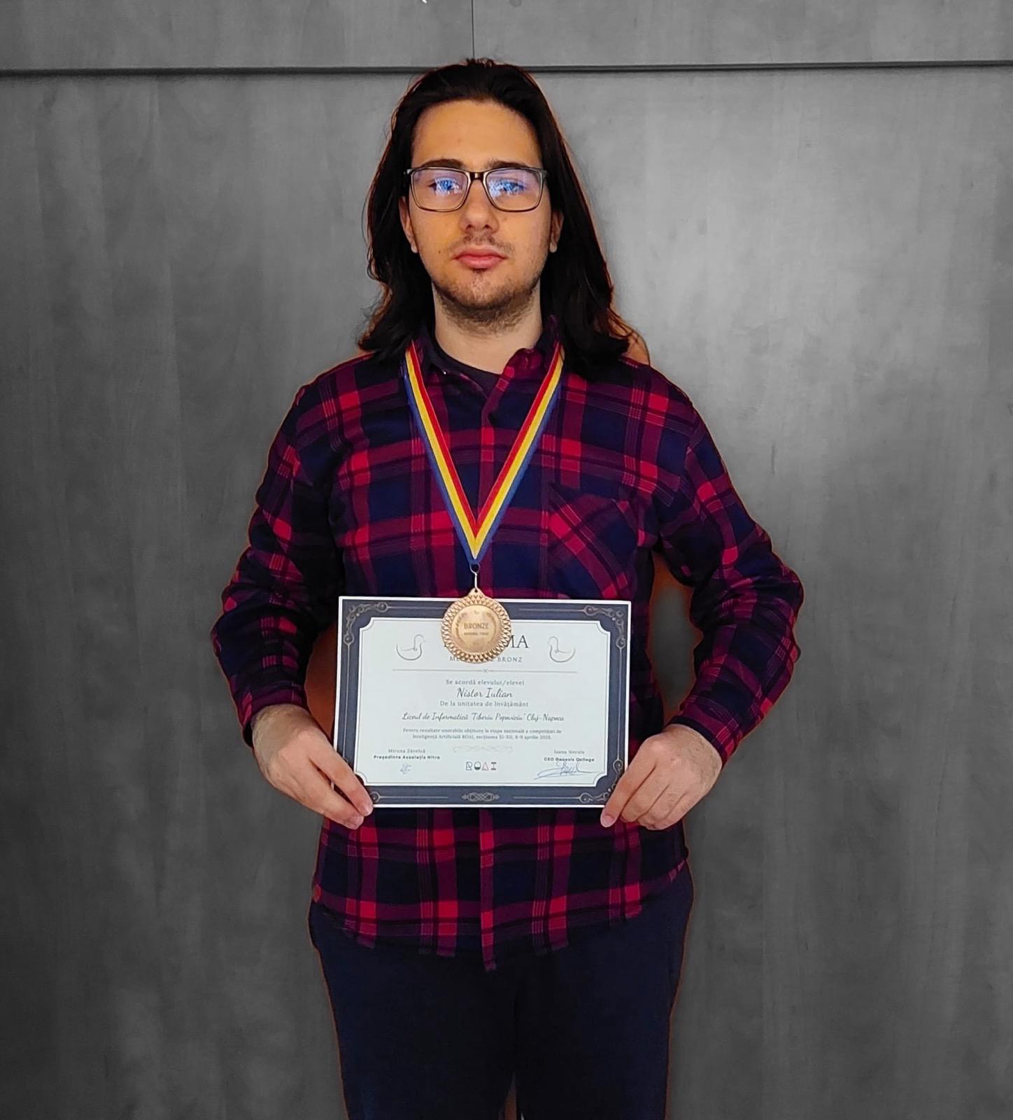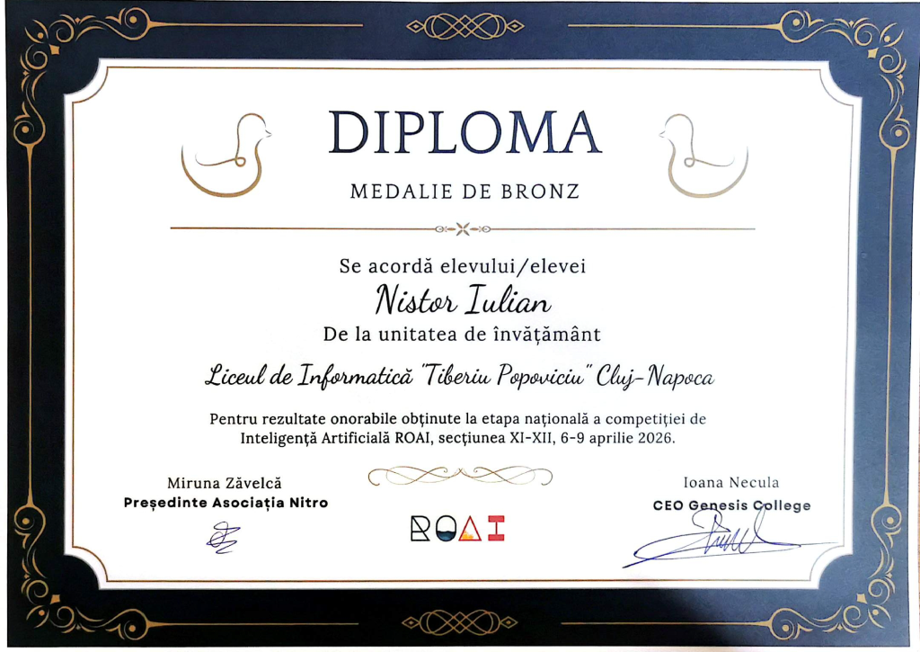 Elevul nostru, Nistor Iulian, din clasa a XII-a B, coordonat de doamna profesoară Giurgea Mihaela, a obținut rezultate de excepție la etapa națională a competiției de Inteligență Artificială, ROAI, desfășurată la București, în perioada 6-9 aprilie 2026. După probe complexe, care au testat nu doar cunoștințele tehnice de programare, ci și capacitatea de inovare în domeniul algoritmilor de AI, elevul nostru a urcat pe podium, adjudecându-și Medalia de Bronz.